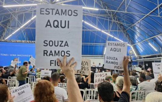 “Não tem como remover essa relação. Isso tem que ser tratado com mais humanidade”, continuou, seguido por gritos e aplausos das pessoas na plateia, que empunhavam cartazes com os dizeres: “Sousa Ramos fica”, “Sousa Ramos resiste” e “túnel não”.